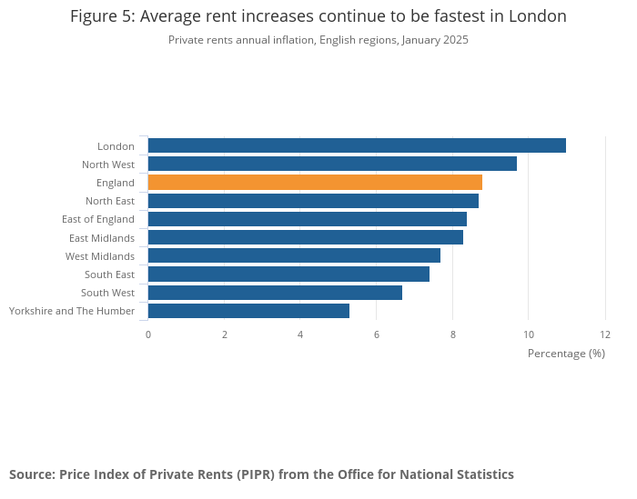 In England, rents inflation was highest in London (11.0%) and lowest in Yorkshire and The Humber (5.3%), in the 12 months to January 2025.