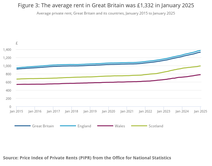 Figure 3: The average rent in Great Britain was £1,332 in January 2025