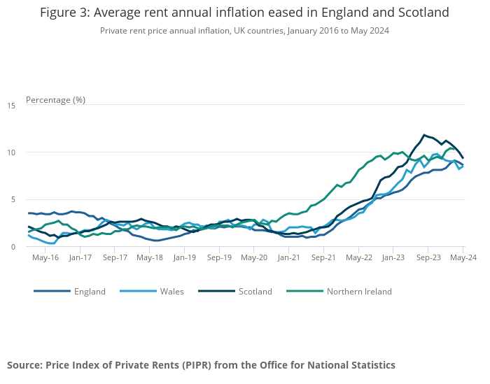 Average rents increased to £1,301 (8.6%) in England, £736 (8.5%) in Wales, and £957 (9.3%) in Scotland, in the 12 months to May 2024.