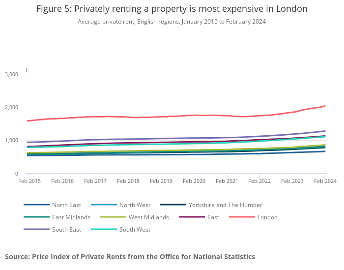 In February 2024, the average monthly private rent was highest in London (£2,035) and lowest in the North East (£658).
