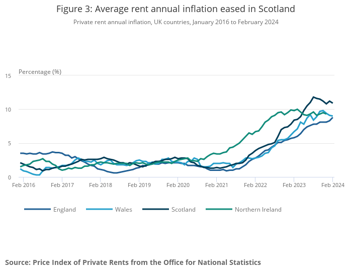 Download this chart Figure 3: Average rent annual inflation eased in Scotland