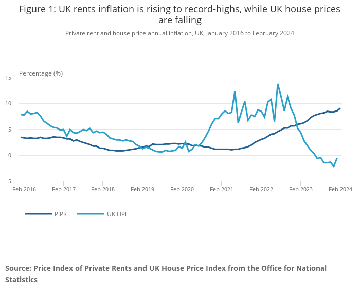 Figure 1: UK rents inflation is rising to record-highs, while UK house prices are falling