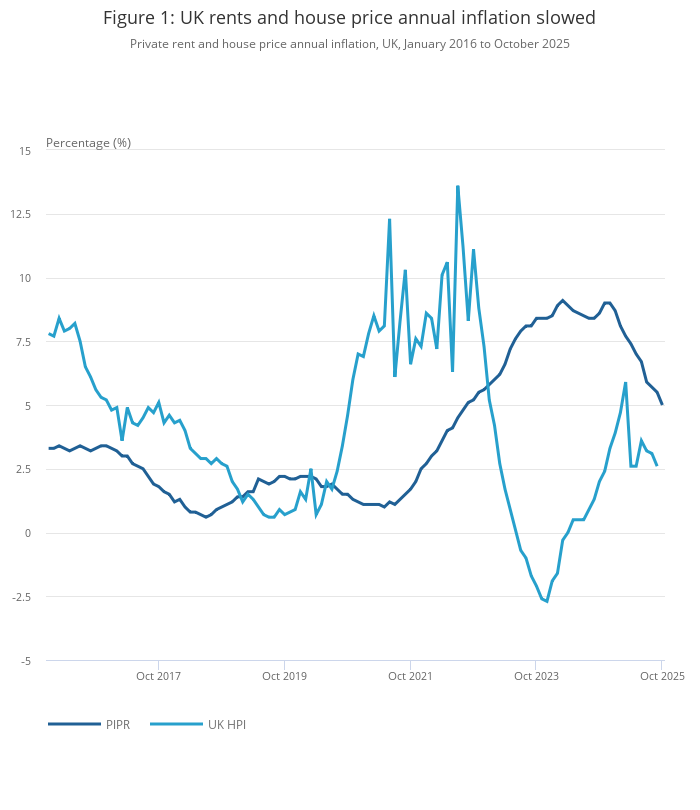 Average UK monthly private rents increased by 5.0%, to £1,360, in the 12 months to October 2025 (provisional estimate); this annual growth rate is down from 5.5% in the 12 months to September 2025.