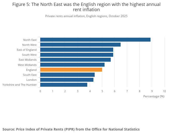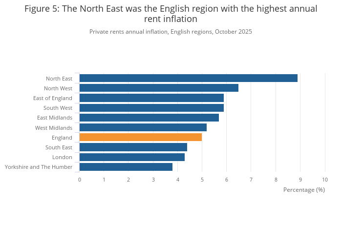 In England, private rents annual inflation was highest in the North East (8.9%) and lowest in Yorkshire and The Humber (3.8%), in the 12 months to October 2025.