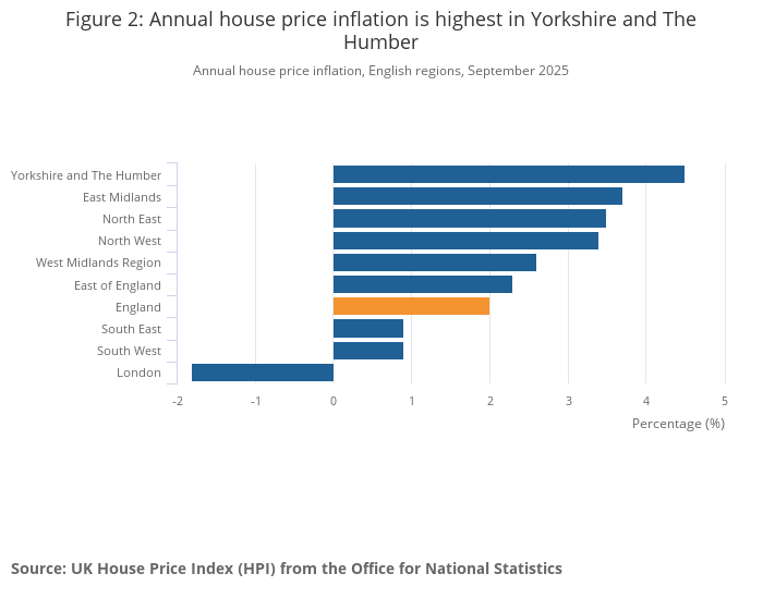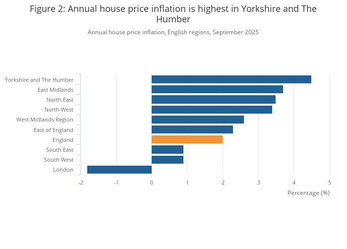 Image .csv .xlsYorkshire and The Humber was the English region with the highest house price inflation, at 4.5%, in the 12 months to September 2025. This was up from 2.7% in the 12 months to August 2025.