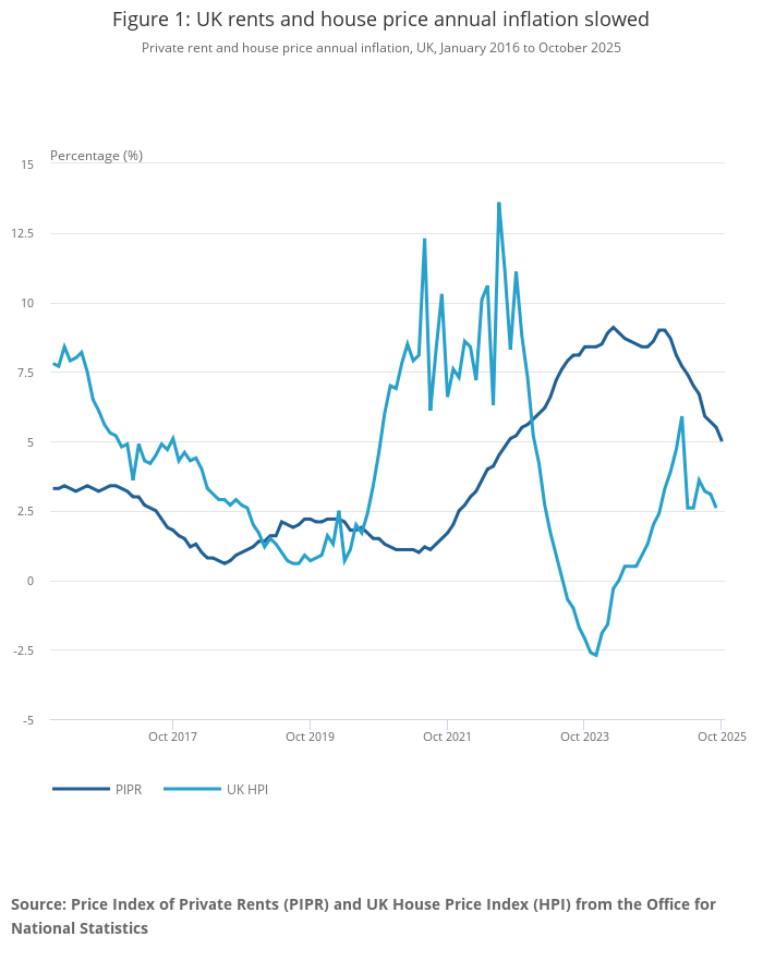 Private rent and house price annual inflation, UK, January 2016 to October 2025