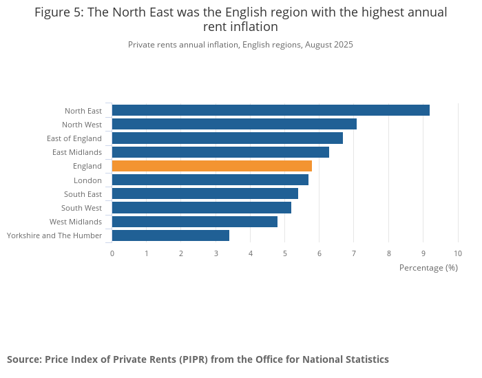 In England, private rents annual inflation was highest in the North East (9.2%) and lowest in Yorkshire and The Humber (3.4%), in the 12 months to August 2025.