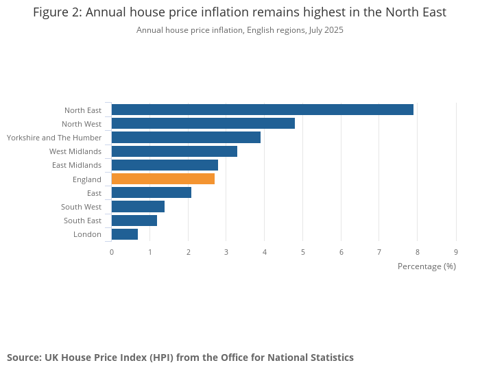 Image .csv .xlsThe North East was the English region with the highest house price inflation, at 7.9%, in the 12 months to July 2025. This was up from 7.7% in the 12 months to June 2025.