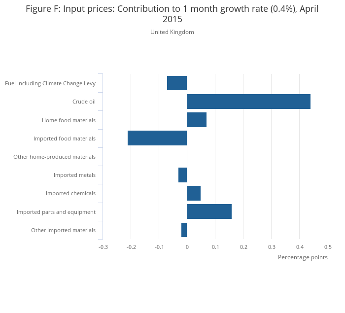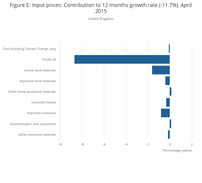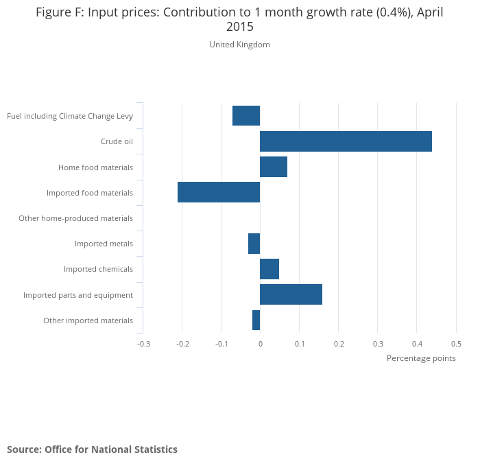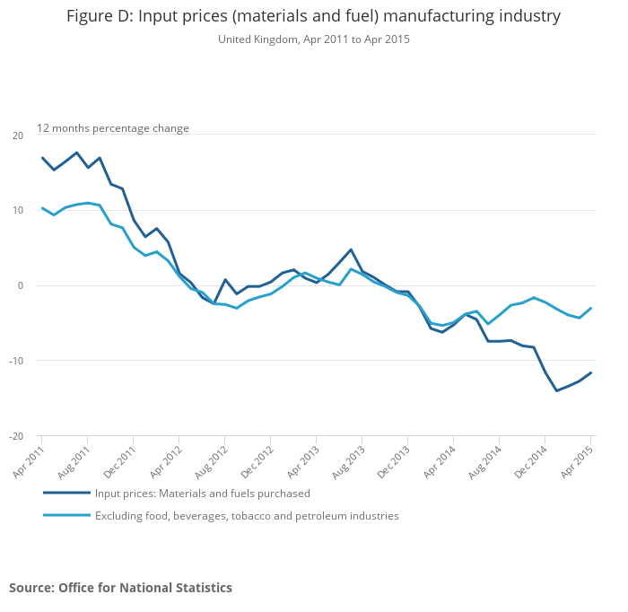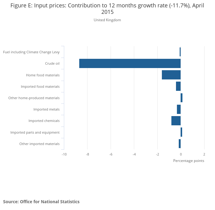 The overall input index for all manufacturing, that is, the price of materials and fuels purchased by manufacturers, fell 11.7% in the year to April 2015, compared with a fall of 12.8% in the year to March 2015. The main downward contributions to the index came from crude oil (down 38.2% in the year to April 2015) and home-produced food (down 11.9% in the year to April 2015).