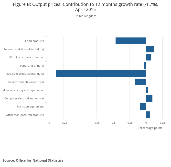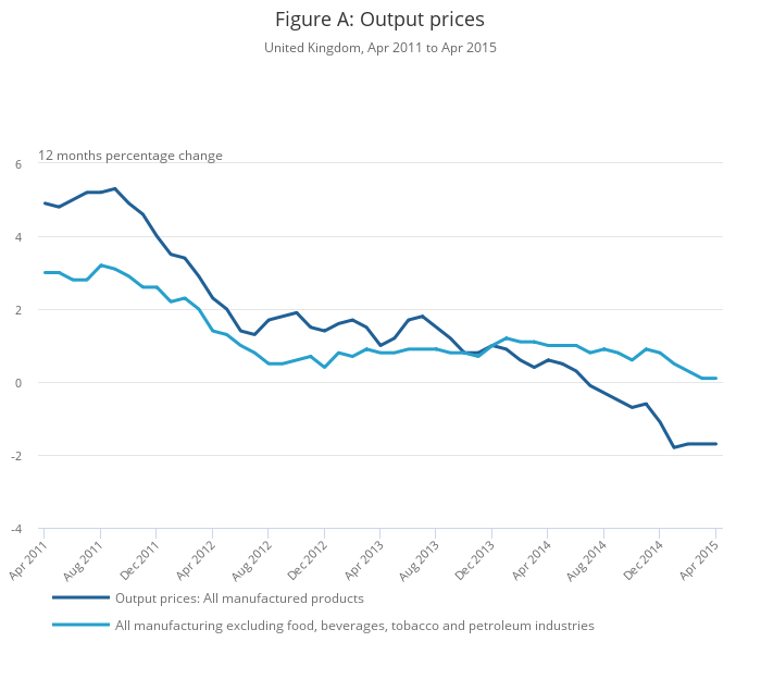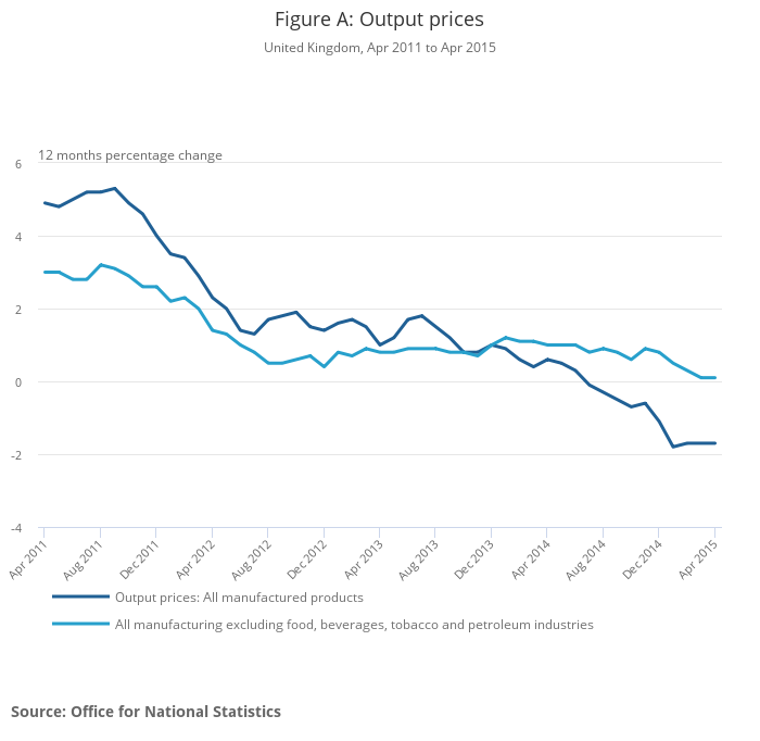 The output price index for goods produced by UK manufacturers (factory gate prices) fell 1.7% in the year to April 2015, unchanged since February 2015
