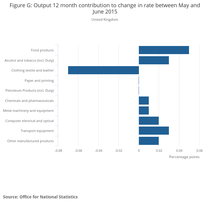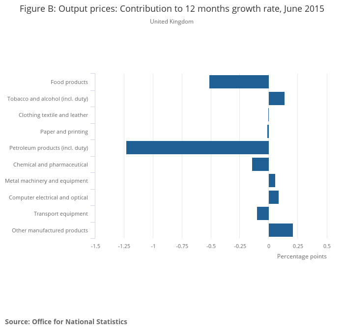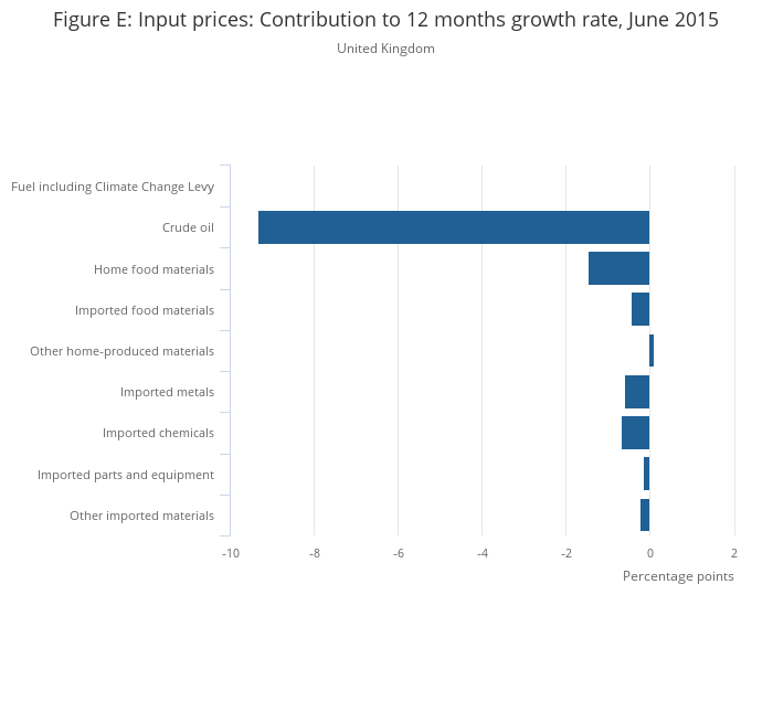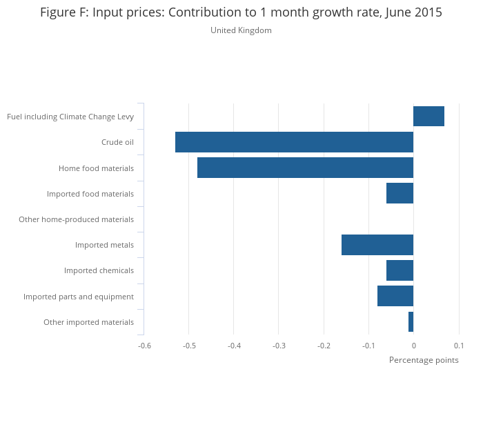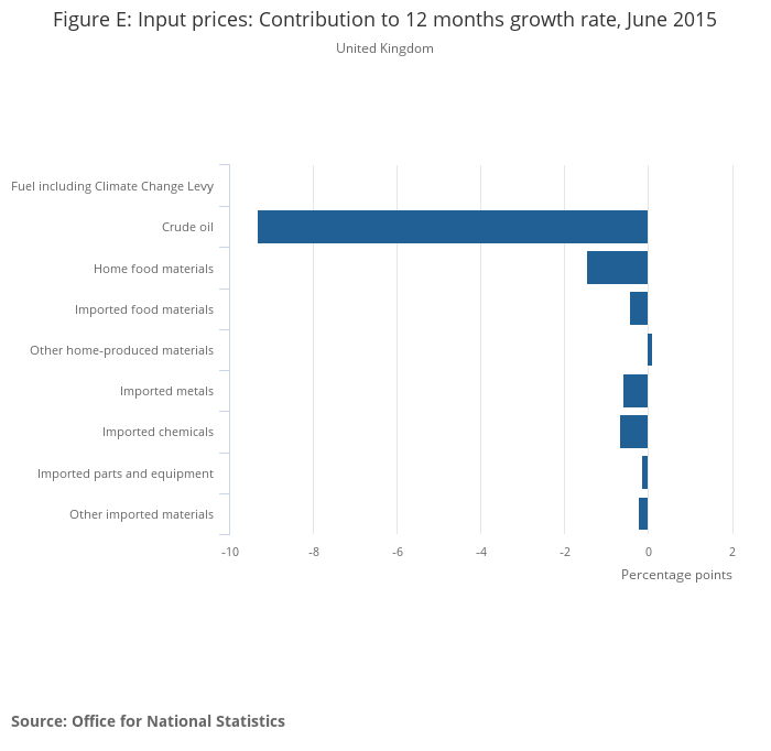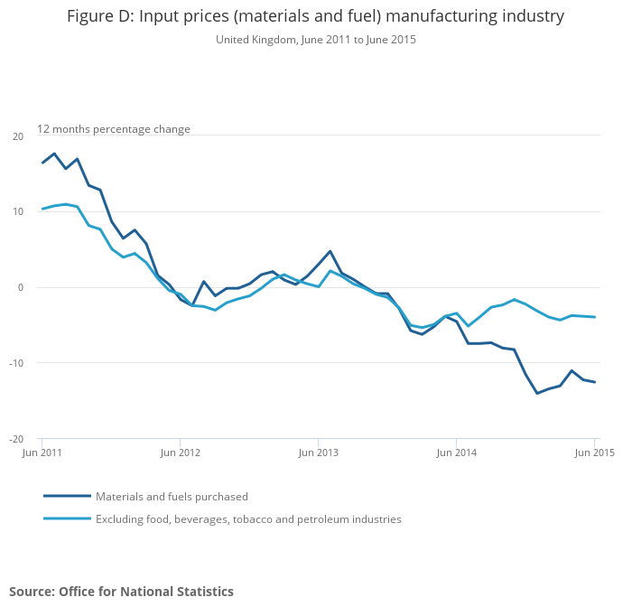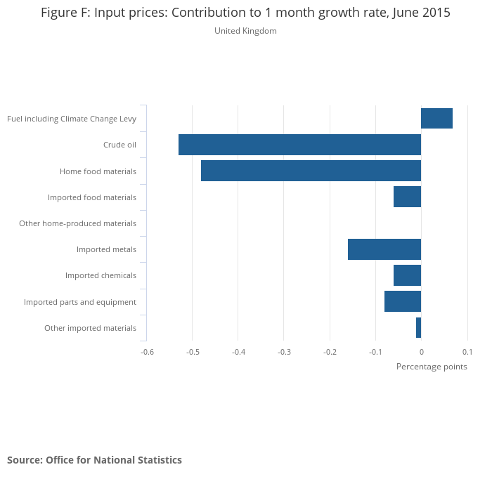The overall input index for all manufacturing, which measures changes in the price of materials and fuels purchased by manufacturers, fell 12.6% in the year to June 2015, compared with a fall of 12.3% in the year to May 2015. The main downward contributions to the index came from crude oil (down 39.7% in the year to June 2015) and home-produced food (down 11.0% in the year to June 2015).