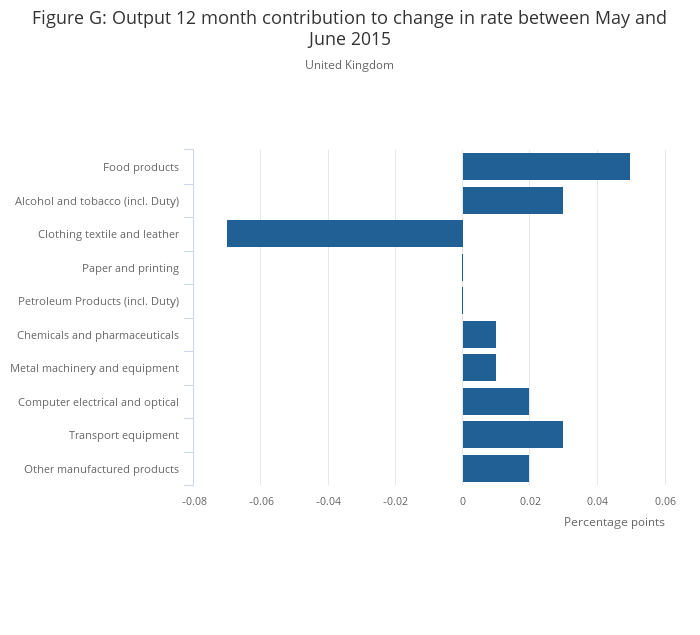 The annual percentage growth rate for the output PPI in June 2015 was -1.5%, up from a fall of -1.6% last month, resulting in an increase in the annual rate of 0.1% between May and June 2015. The main contributions to this change in the rate came from food products, offset by a fall in clothing, textiles and leather products (Figure G). Food product prices fell 3.2% in the year to June 2015, up from a fall of 3.5% in the year to May 2015, and clothing, textiles and leather product prices saw no movement (0.0%) in the year to June 2015, down from a rise of 0.5% last month.