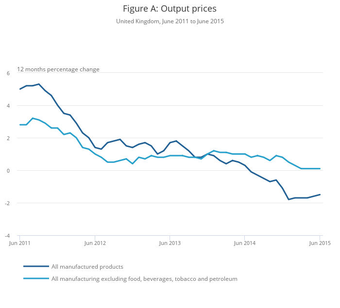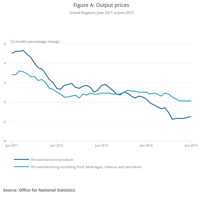 The factory gate prices (output prices) for goods produced by UK manufacturers fell 1.5% in the year to June 2015, compared with a fall of 1.6% in the year to May 2015