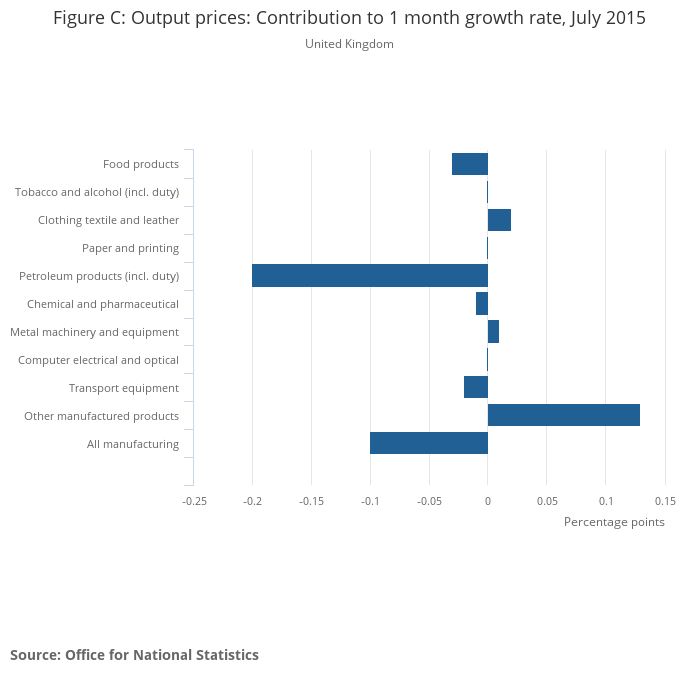 The price of goods bought and sold by UK manufacturers, as estimated by the producer price index, continued to fall in the year to July 2015. Crude oil continued to drive down input prices, feeding through to a drop in output prices of petroleum products