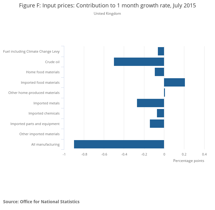 The overall input index for all manufacturing, which measures changes in the price of materials and fuels purchased by manufacturers, fell 12.4% in the year to July 2015, compared with a fall of 13.1% in the year to June 2015. The main downward contributions to the index came from crude oil, home-produced food and imported metals (down 39.9%, 8.7% and 13.1% respectively in the year to July 2015).