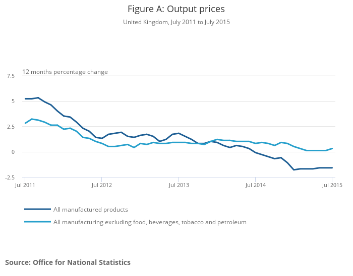 Factory gate prices (output prices) for goods produced by UK manufacturers fell 1.6% in the year to July 2015, unchanged since May 2015