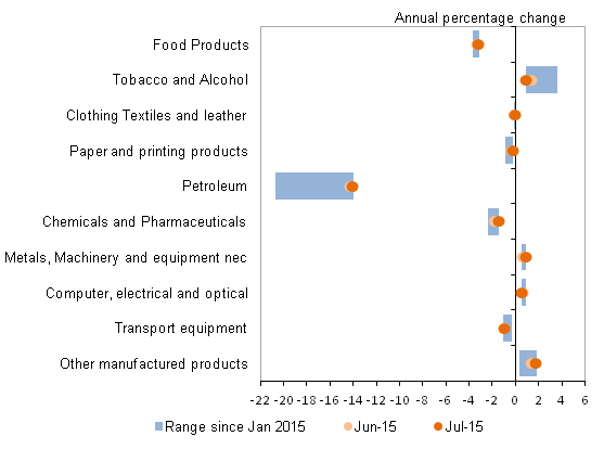 Factory gate prices fell 1.6% in the year to July 2015, unchanged since May 2015. Prior to July 2014, there had been no fall in the annual rate since October 2009, when it fell 0.1%. The main contribution to the annual rate for July 2015 came mainly from a fall in the price of petroleum and food products (Figure B).