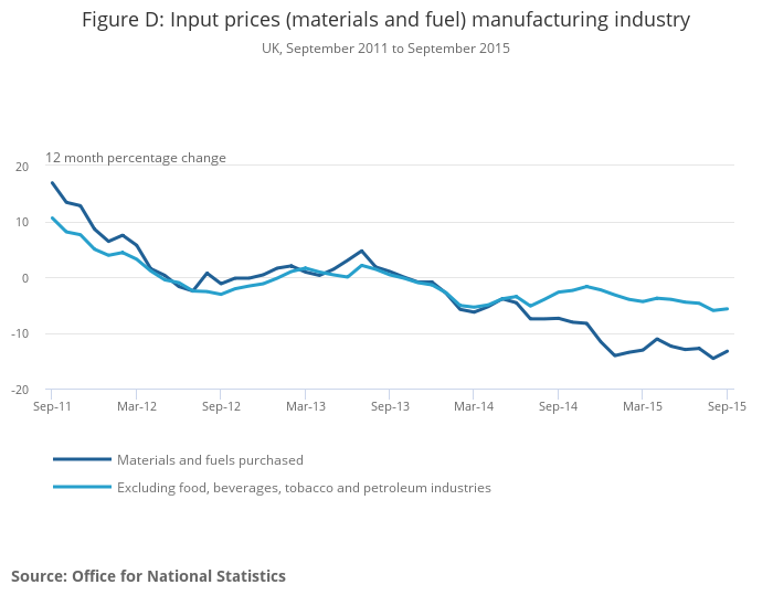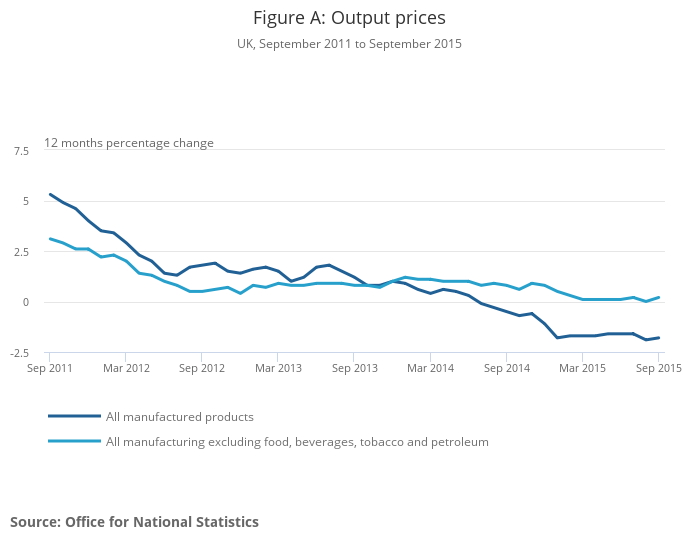 The price of goods bought and sold by UK manufacturers, as estimated by the producer price index, continued to fall in the year to September 2015. Crude oil continued to drive down input prices, feeding through to a drop in output prices of petroleum products