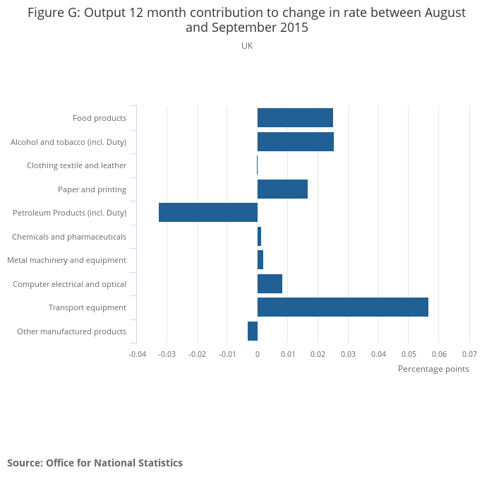 The annual percentage growth rate for the output PPI in September 2015 fell 1.8%, compared with a fall of 1.9% last month, resulting in an increase in the annual rate of 0.1%. This was due to a rise in the contribution from transport equipment primarily vehicle parts, which was partially offset by a fall in refined petroleum products (Figure G).