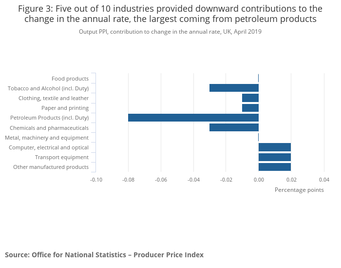 Petroleum products provided the largest upward contribution to the monthly rate of output inflation, at 0.13 percentage points. Prices for this product group rose by 1.3% on the month in April 2019. Chemicals and pharmaceuticals provided the only downward contribution of 0.01 percentage points, falling to 0.1% on the month.