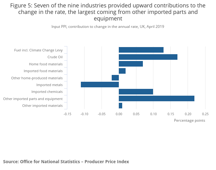 There was a 0.6 percentage points increase in the annual rate for inputs between March and April 2019, with seven out of the nine product groups displaying upward contributions to the change in the rate. Other imported parts and equipment provided the largest upward contribution of 0.22 percentage points, with crude oil and fuel also making positive contributions, at 0.17 and 0.13 percentage points respectively.