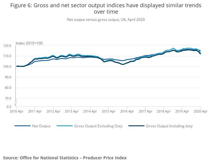 Producer Price Indices (PPIs) are measured on two different bases: gross and net of inter-sector sales. Gross sector PPIs include products sold by one business to another business classified to the same industry sector. Net sector PPIs exclude (net out) products sold by a business to another business classified to the same industry sector. The Office for National Statistics (ONS) currently headlines with net sector PPIs, which include duty. We will move our headline to a gross sector basis excluding duty by summer 2020, in line with international best practice.