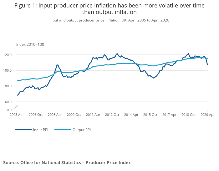 The headline rate of output inflation for goods leaving the factory gate was negative 0.7% on the year to April 2020, down from 0.3% in March 2020.