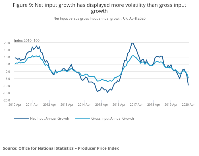 Image .csv .xlsGross and net sector output PPIs display similar trends over time, although the gross indices show higher volatility, particularly at times of high inflation, either positive or negative (Figure 7). For the net output PPI, the annual growth fell to negative 0.7% in April 2020, down from 0.3% in March 2020. For the gross output excluding duty PPI, the annual growth in April 2020 was negative 3.4%, down from negative 0.9% in March 2020.