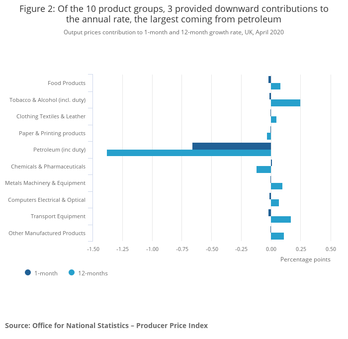On the month, crude oil also provided the largest downward contribution of 3.82 percentage points, with prices falling by 34.1%. This follows another large monthly drop in crude oil prices of 29.6% in March. These are the lowest the monthly rates have ever been since records began in January 1996.