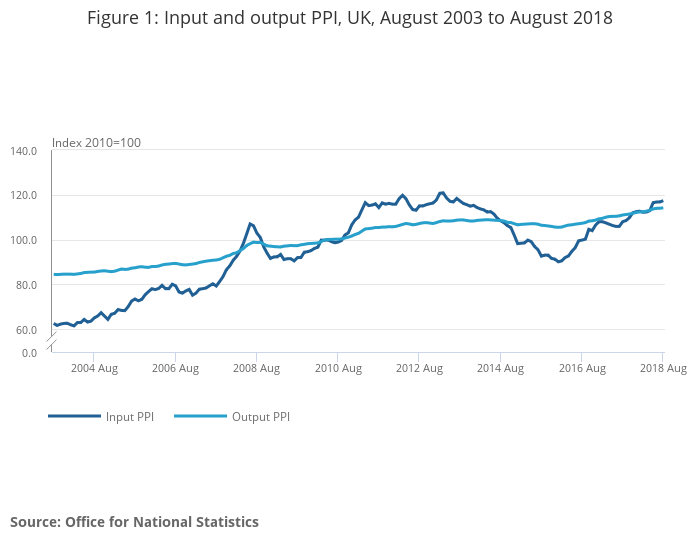 The headline rate of output inflation for goods leaving the factory gate was 2.9% on the year to August 2018, down from 3.1% in July 2018.