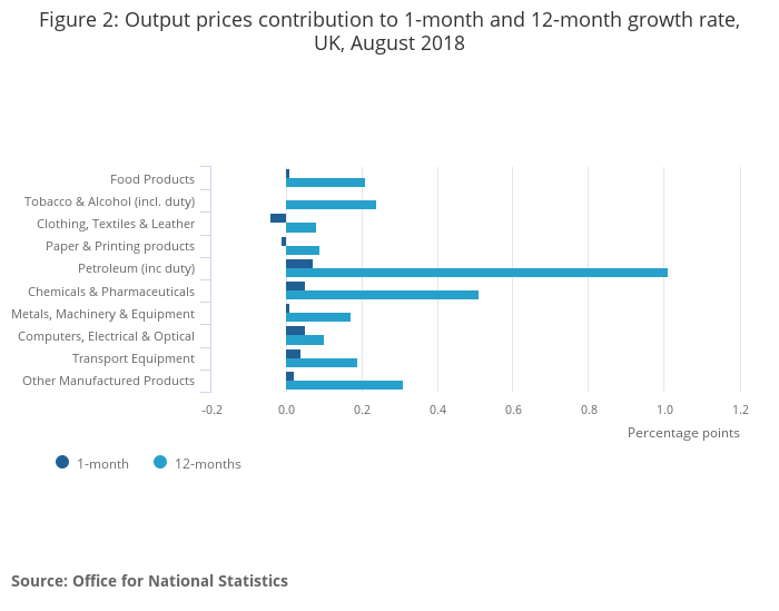 Chemicals and pharmaceutical products showed the second-largest upward contribution of 0.51 percentage points to the annual rate, with the 12-month rate reaching 7.0% in August 2018, the highest it has been since April 2011.