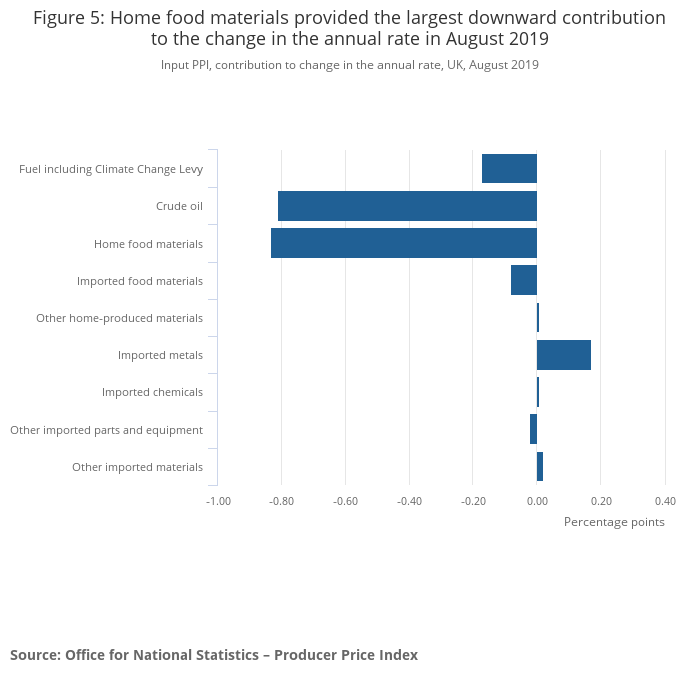 Food products provided the largest downward contribution to the monthly rate of output inflation, at 0.45 percentage points. This product group displayed negative inflation of 0.5% on the month in August 2019 which is the lowest the rate has been since January 2018.