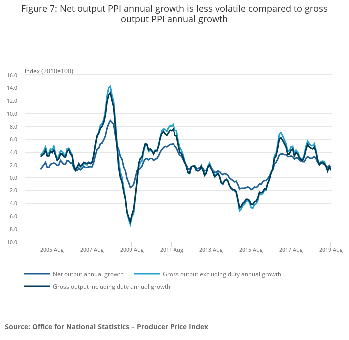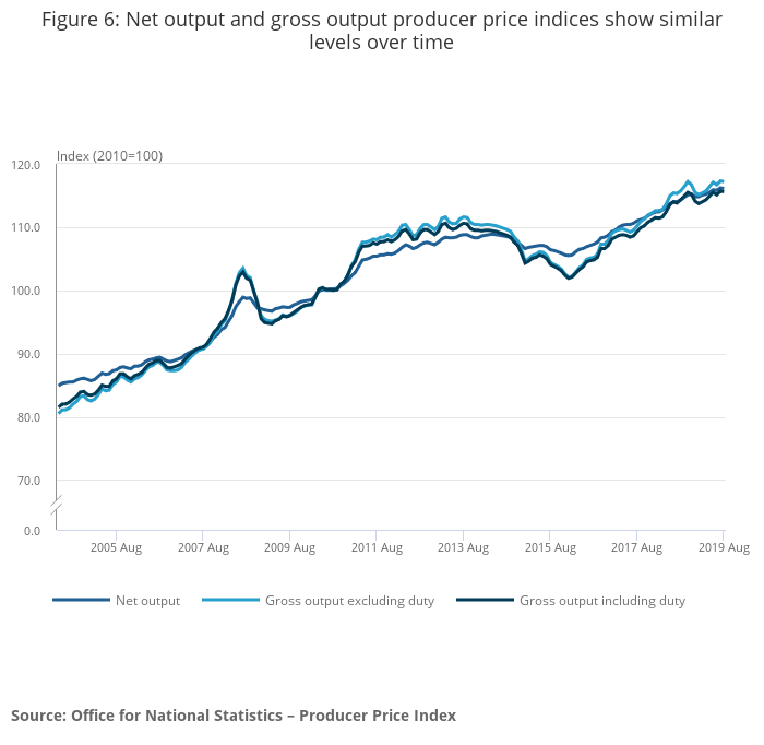 Producer price indices (PPIs) are measured on two different bases, gross and net of inter-sector sales. Gross sector PPIs include products sold by one business to another business classified to the same industry sector. Net sector PPIs exclude (net out) products sold by a business to another business classified to the same industry sector. The Office for National Statistics (ONS) currently headlines with net sector PPIs, which include duty. We will move our headline to a gross sector basis excluding duty early in 2020, in line with international best practice.