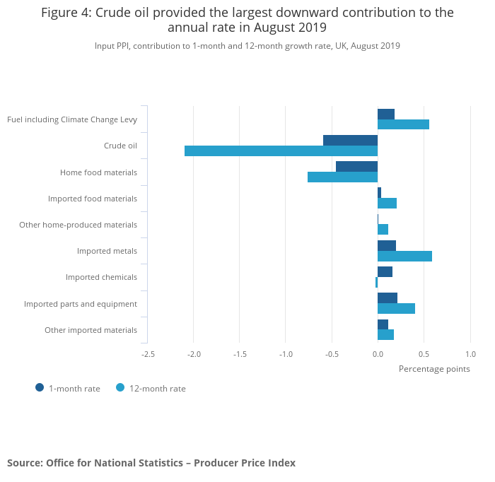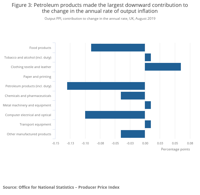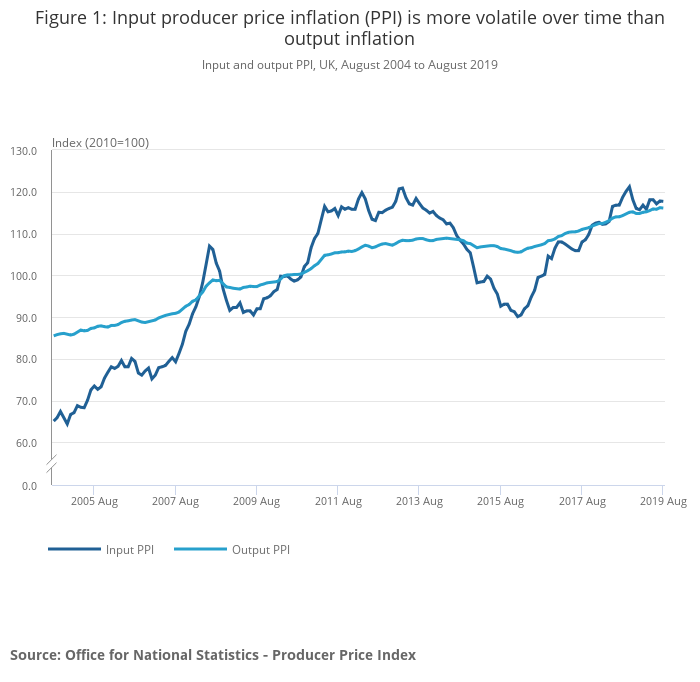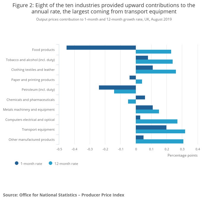 The headline rate of output inflation for goods leaving the factory gate was 1.6% on the year to August 2019, down from 1.9% in July 2019.