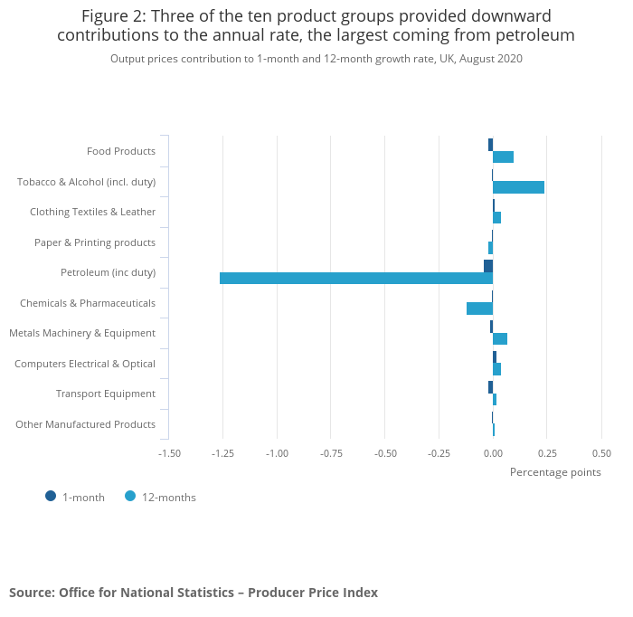 The headline rate of output inflation for goods leaving the factory gate was negative 0.9% on the year to August 2020, unchanged from June 2020.
