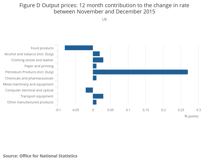 Factory gate prices fell 1.2% in the year to December 2015, compared with a decrease of 1.5% in the year to November 2015. This index has now seen negative movements on the year every month since July 2014. The main contribution to the annual rate for November 2015 came from petroleum products. Smaller falls in the prices of food products, chemicals and pharmaceuticals, and transport equipment also contributed towards the fall in the output of manufactured product prices (Figure B).