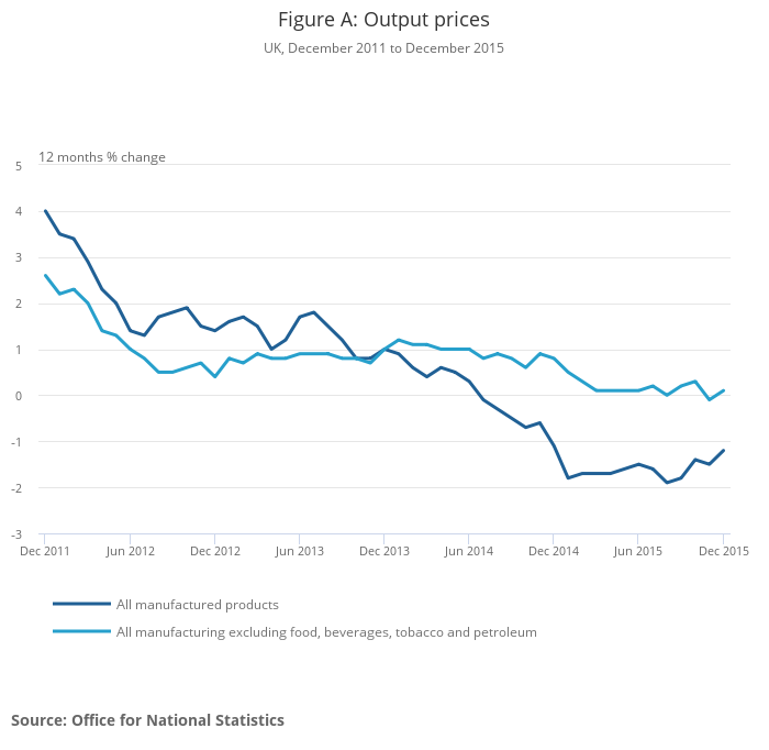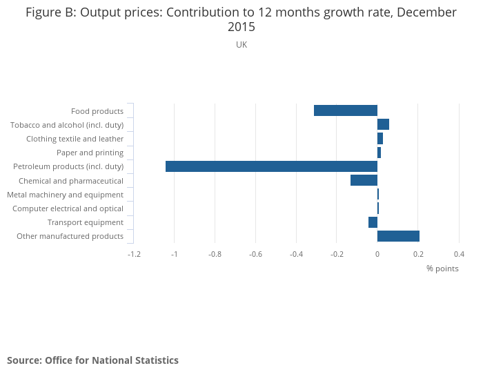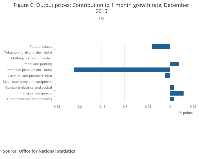 The price of goods bought and sold by UK manufacturers, as estimated by the producer price index, continued to fall in the year to December 2015. Crude oil continued to drive down input prices, feeding through to a drop in output prices of petroleum products