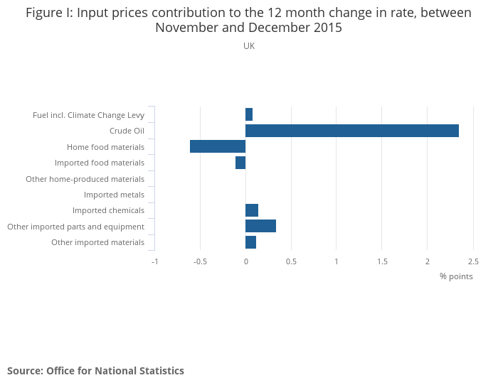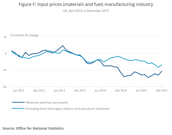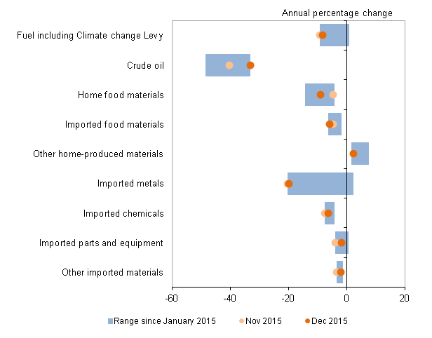 The overall input index for all manufacturing, which measures changes in the price of materials and fuels purchased by manufacturers, fell 10.8% in the year to December 2015, compared with a fall of 13.1% in the year to November 2015. The main downward contributions to the index came from crude oil with much smaller, but notable, downward contributions from home produced food and imported metals.