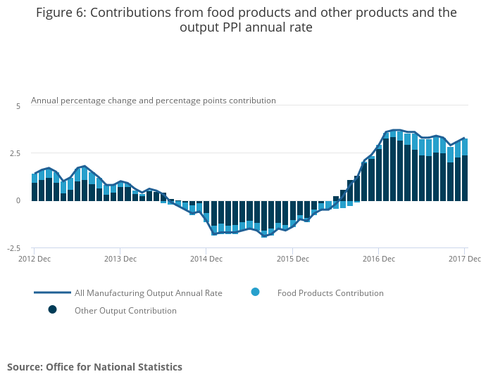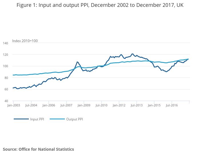 The headline rate of inflation for goods leaving the factory gate (output prices) rose 3.3% on the year to December 2017, up from 3.1% in November 2017.