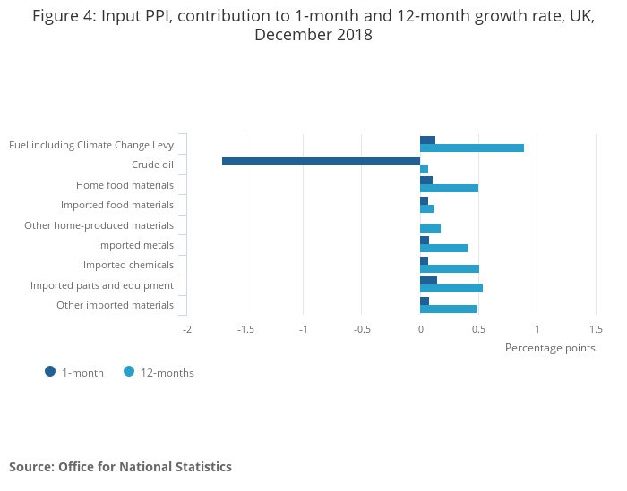 Figure 4: Input PPI, contribution to 1-month and 12-month growth rate, UK, December 2018