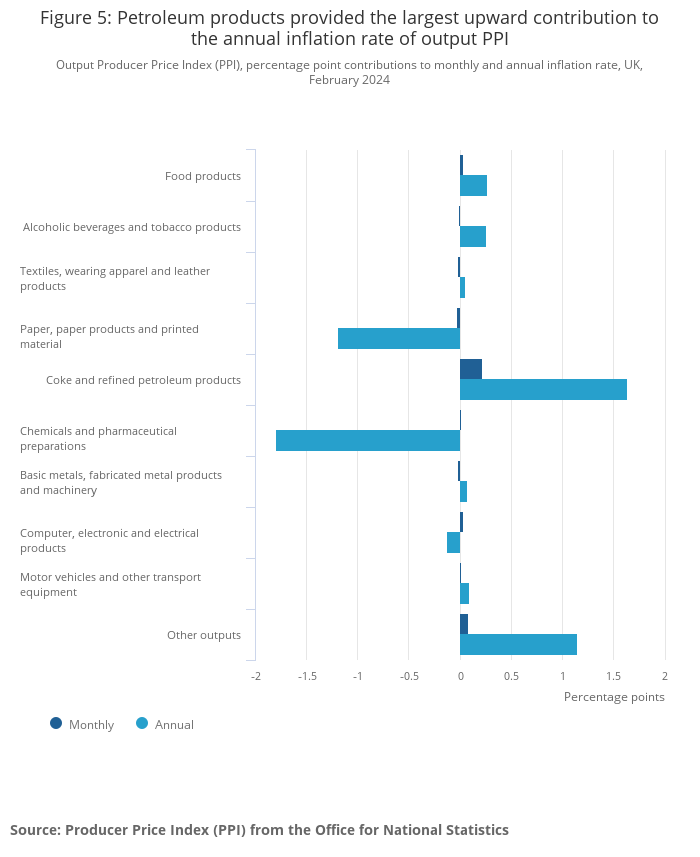 Output Producer Price Index (PPI), percentage point contributions to monthly and annual inflation rate, UK, February 2024