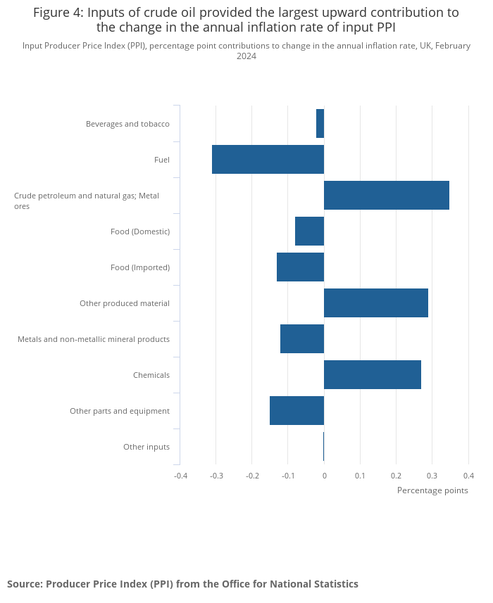 Input Producer Price Index (PPI), percentage point contributions to change in the annual inflation rate, UK, February 2024