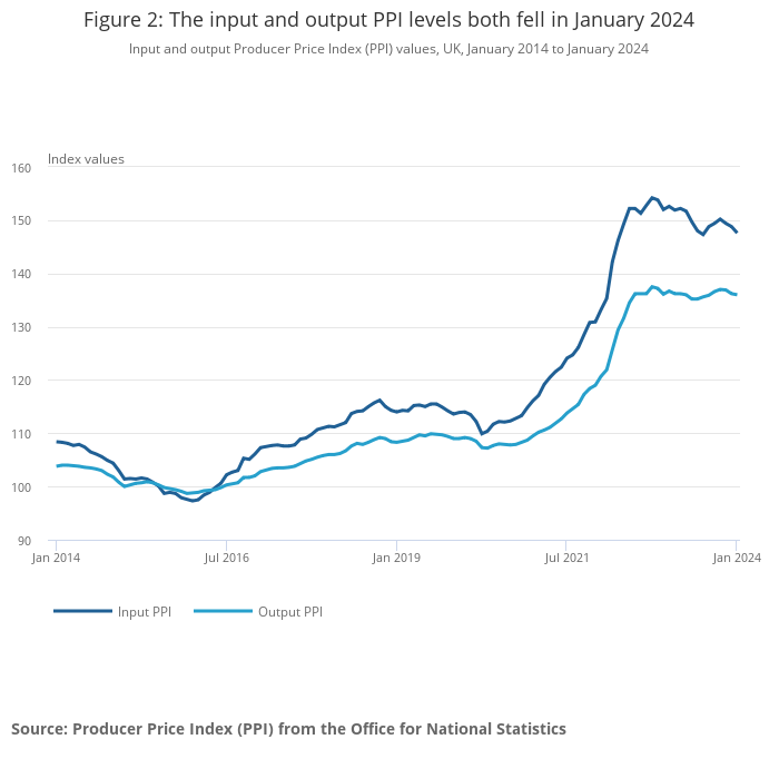 - Producer output (factory gate) prices fell by 0.6% in the year to January 2024, down from a rise of 0.1% in the year to December 2023.