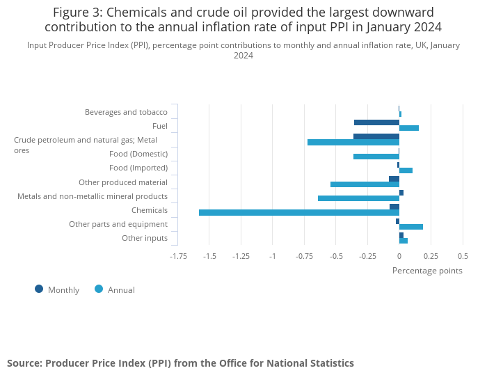 Input Producer Price Index (PPI), percentage point contributions to monthly and annual inflation rate, UK, January 2024