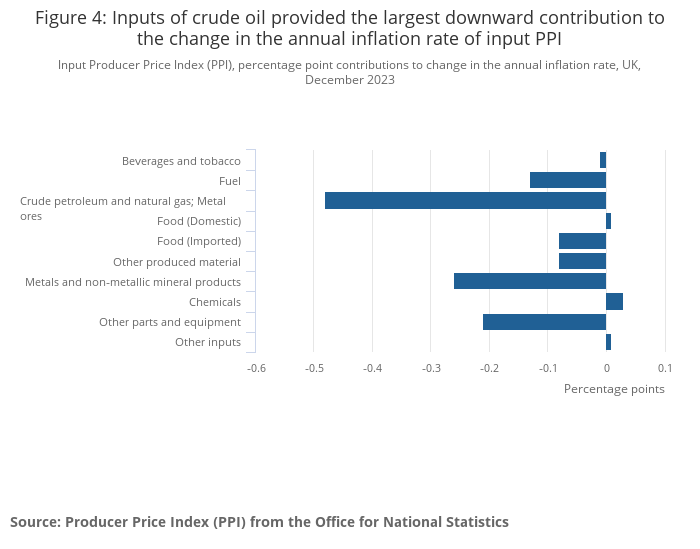 Input Producer Price Index (PPI), percentage point contributions to change in the annual inflation rate, UK, December 2023