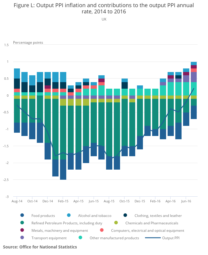 Image .csv .xlsIn the year to July 2016, output PPI inflation entered into positive territory for the first time since July 2014. Figure L shows the 12 month percentage change and percentage point contributions of output PPI components to output PPI inflation for the past 2 years. In this period, there have been downward pressures from food products, refined petroleum products (including duty), and chemicals and pharmaceuticals. The downward pressure from refined petroleum products (including duty) have eased off from September 2015 onwards as crude oil prices have stabilised as explained earlier. In the same period, transport equipment initially contributed negatively to output PPI inflation but this trend reversed from February 2016 onwards and in July 2016 there was considerable increase in its positive contribution to output PPI inflation.
