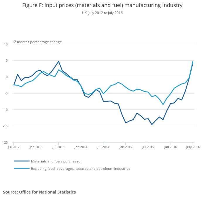 The overall price of materials and fuels bought by UK manufacturers for processing (total input prices) rose 4.3% in the year to July 2016, compared with a fall of 0.5% in the year to June 2016.