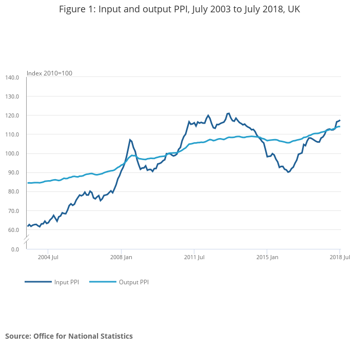 Figure 1: Input and output PPI, July 2003 to July 2018, UK