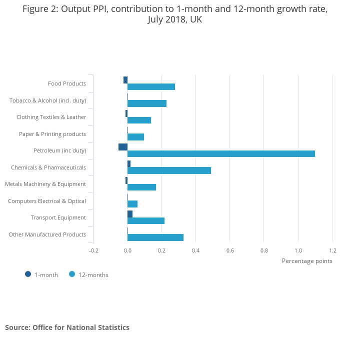 Figure 2: Output PPI, contribution to 1-month and 12-month growth rate, July 2018, UK