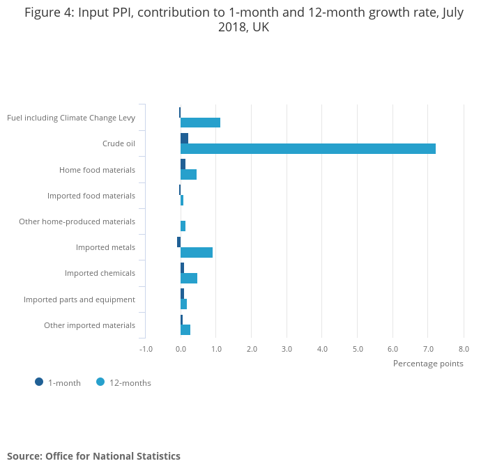 Figure 4: Input PPI, contribution to 1-month and 12-month growth rate, July 2018, UK